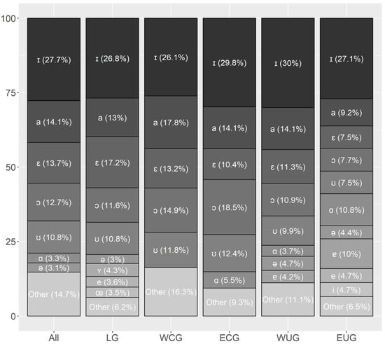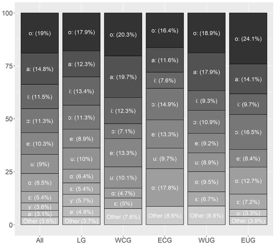 The percentages of the vowels are presented separately for the three groups (V, Vː, VV). For a better comparison, only vowels found in all areas were considered for calculation. To properly display the data, all values below a threshold of 3% were taken together as a single group “Other”. The complete vowel frequency counts of each area can be accessed in Appendix A (Table A1, Table A2 and Table A3). Summing up the general tendencies of Standard German vowel frequencies from the introduction, [ə] is the most frequent followed by unrounded non-back vowels [a, ɪ, i, ɛ, e], back vowels [u, ʊ, o, ɔ] and rounded front vowels [y, ʏ, ø, œ].