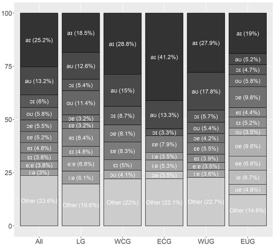 Percentage of diphthongs in monosyllabic lexemes without morpheme boundaries for all areas (All), Low German (LG), West Central German (WCG), East Central German (ECG), West Upper German (WUG) and East Upper German (EUG).