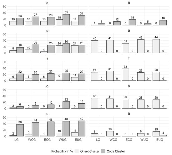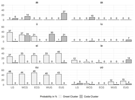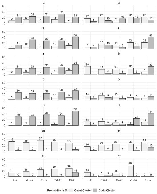 Probability of onset (lighter gray) and coda (darker gray) consonant clustering for different vowel types (V, Vː, VV) in dialects of Low German (LG), West Central German (WCG), East Central German (ECG), West Upper German (WUG) and East Upper German (EUG).