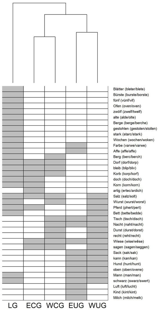 - Göschel, Joachim. 1992. Das Forschungsinstitut für Deutsche Sprache “Deutscher Sprachatlas”, Wissenschaftlicher Bericht. Marburg: Forschungsinstitut für Deutsche Sprache. [Google Scholar]