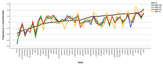 The corpus frequency (CF) (logarithmized to base 10, z-transformed) and median of the subjective frequency (MSF) (z-transformed) for monolinguals (MOs), late bilinguals (LBs), heritage speakers (HSs) and foreign language learners (FLs) of the 49 analyzed Russian verbs (English equivalents can be found in the repository at https://slavdok.slavistik-portal.de/receive/slavdok_mods_00000353, accessed on 27 June 2024), as sorted by the corpus frequency.
