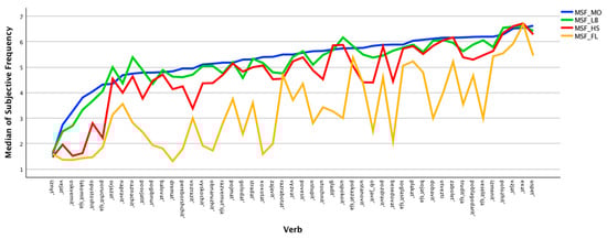 From the SF values collected, we calculated the median of grouped data for each of the 49 verbs in each of the four studied groups. The calculation of the median of grouped data resulted in a median with several decimal places. It allowed for a more finely grained SF scale of the verbs than the simple median, which was limited to values with the decimal places 0.0 or 0.5. We refer to this value as the median of the subjective frequency (MSF).