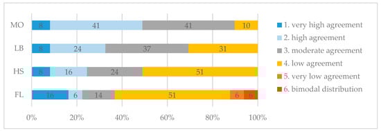So far, we have only looked at the median of SF judgments while ignoring dispersion. This is the subject of our next hypothesis: we assumed that the lower the exposure to Russian, the more heterogeneous the SF judgments would be within the groups (Hypothesis 2.2). To investigate this, we determined the interquartile range IQR for every verb in each group and assigned it to one of six levels of agreement, from 1 (very high agreement) to 6 (bimodal distribution) (cf. Table 5 above). In the MO group, half of the verbs were judged with very high or high agreement, while almost the entire other half was assessed with moderate agreement (cf. Figure 3). Only 10% of the verbs show a low level of agreement, and no verb has very low agreement or bimodal distribution. The distribution in the LB and HS groups is similar to that of MOs, but the proportion of good agreement decreases, and the proportion of moderate and low agreement increases. In the HS group, as many as 50% of all verbs show low agreement. The FL group differs strongly from the other three. First, the proportion of verbs with very high to moderate agreement combined is less than 40%. Second, this is the only group that judges verbs with very low agreement or even bimodal distribution. Therefore, Hypothesis 2.2 is fully confirmed. Another interesting detail is the proportion of verbs with very high agreement: at 16%, the proportion is higher in the FL group than in the other groups, which can be explained by the high number of verbs that are unknown to the FL group.