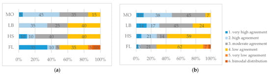 In our last hypothesis (Hypothesis 2.3), we assumed that the heterogeneity in the groups with less exposure to Russian should be particularly large for the rarer verbs. To analyze this question, we split the verbs into low-frequency and high-frequency parts based on the CF, thereby using the same procedure as in Section 3.1.11 However, the results for the low-frequency (Figure 4a) and those for the high-frequency verbs (Figure 4b) are very similar to those of all 49 verbs together (Figure 3 above). In the MO and LB groups, there is slightly more heterogeneity for the low-frequency verbs compared with those of high-frequency verbs. Surprisingly, for the HS and the FL group—in contrast to MOs and LBs, the agreement is even higher for the low-frequency verbs than for the high-frequency verbs: Of the low-frequency verbs, 60% in the case of HSs and 50% in the case of FLs were rated with an agreement level of 1–3, which is a larger portion than that of all the verbs combined. Moreover, the FL group rated 35% of the low-frequency verbs with very high agreement. This can be explained by the high number of verbs unknown to the members of this group, which consequently are judged by “1” (“I never encounter this verb”). On the other hand, the heterogeneity in the FL group is especially high for the high-frequency verbs, with 72% of verbs with an agreement level of 4–6. Therefore, Hypothesis 2.3 was only partially confirmed.