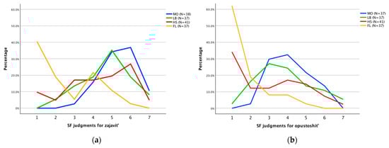 Percentage of frequency judgments of monolinguals (MOs), late bilinguals (LBs), heritage speakers (HSs), and foreign language learners (FLs) for (a) zajavit’ ‘to declare, to claim’; (b) opustošit’ ‘to devastate’ (from 1 “I never encounter this verb” from 7 “I encounter this verb at every turn”).