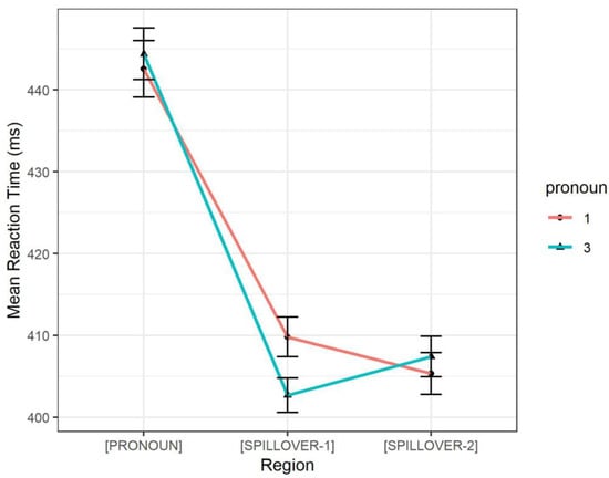 Three analyses were conducted on the reading times for perspective (first versus third person): one for the target words (the pronouns), one for the first words after the pronouns (first spillover), and one for the second words after the pronouns (second spillover). Figure 1 shows the mean reading times and standard errors per perspective. Differences can be observed between first-person pronouns and third-person pronouns in the first spillover region (target word: M1 = 442.6, SD1 = 196.7; M3 = 444.4, SD3 = 191.7; first spillover M1 = 409.8, SD1 = 136.6; M3 = 402.7, SD3 = 128.0; second spillover M1 = 405.4, SD1 = 143.8; M3 = 407.4, SD3 = 150.9). Stories with third-person pronouns appear to be read faster than stories with first-person pronouns. However, we did not find significant main effects of perspective on the reading times of the target word (β = 0.006, SE = 0.021, t = 0.257, p = 0.797), first spillover (β = −0.012, SE = 0.017, t = −0.744, p = 0.458), nor second spillover (β = −0.002, SE = 0.0017, t = −0.53, p = 0.913). Further, we do not observe effects of the covariate appreciation on reading times in any regions of interest.