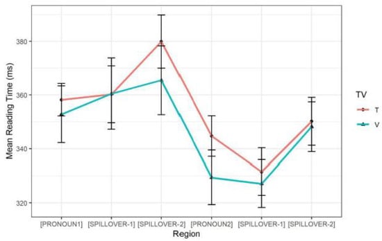 Next, we constructed six models for the analysis of T-/V-effects on reading times: one for each of the two target words (the pronouns) in the question (viz. Et tu/vous, est-ce que tu/vous as/avez…? ‘And you, have you…’) and one for each of the pronouns’ first and second spillovers. We constructed separate models for the first and second occurrence of a pronoun because the question starts by directly addressing the participant directly after the short story, which was written in first or third person. The surprisal effect may thus be larger for the first occurrence of a pronoun of address. Figure 2 shows the mean reading times and standard errors of the two target words in the question and their two spillovers. The reading times are lower for V (M = 347.3, SD = 100.8) than for T (M = 354.1, SD = 82.8), except in the first spillover of the first pronoun.
