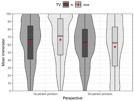Violin plot of the total immersion scores per narrative perspective (first and third person) and pronoun of address (T and V); the red dot represents the mean score.
