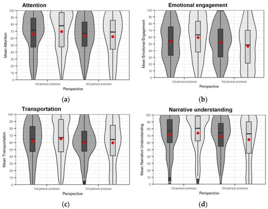 Violin plots for immersion subscales scores per narrative perspective (first and third person) and pronoun of address (T and V): (a) attention; (b) emotional engagement; (c) transportation; and (d) narrative understanding. The red dot represents the mean score.