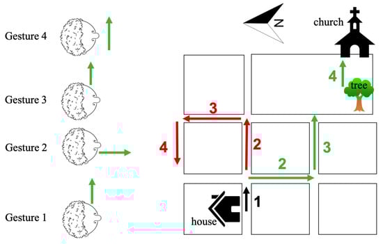 Wayfinding according to gestures produced based on geocentric FoR (in green) and its understanding according to the egocentric FoR (in red).