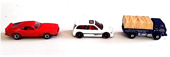 Two tables were placed 4–5 m apart, oriented according to cardinal axes (either North–South or, more commonly, East–West). For this task, called “animals in a row”, researchers have used little toy animals (hence the name), usually a pig, a horse and a cow (; ; ). However, for practical reasons, we decided to change the animals to toy cars (1/64 scale). Like toy animals, these stimuli also have an intrinsic orientation (i.e., a clear front and back), are all symmetric along their left ⁄ right axis and are familiar objects to the participants. We used different models and shapes, and each car had a specific color: red, white or blue. See Figure 2.