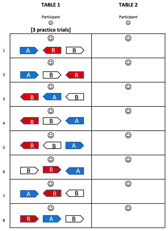 Predetermined configuration of the stimuli (A = blue; R = red; B = white).