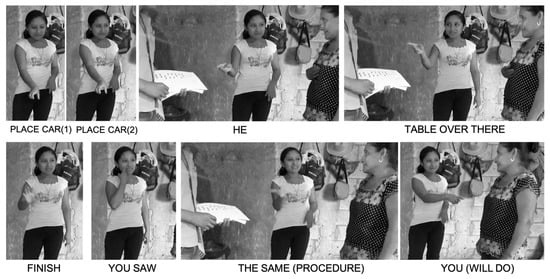 The dynamic was as follows: The procedure was explained to the participants in detail, either in Maya by the researcher or in YMSL by an interpreter. If the participant did not understand the instructions of the experiment, the explanation was repeated again. The task was conducted in the Yucatec Maya language for hearing signers by A. Tuz Baas and in YMSL for deaf signers. For this, the help of a YMSL interpreter was necessary to clearly explain the procedure and to avoid misunderstandings. Instructions in YMSL are presented in Figure 4 and Figure 5.