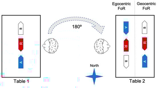 As with the rotation task, there were two possible options for reproducing the configuration, both considered “identical” or “correct”. The first involves the use of the egocentric FoR, in which case, the Matcher will have a similar configuration to the Director, but each one will be arranged from their viewpoint, that is, the Matcher’s configuration will be the mirror image of the Director’s (see Figure 11). The second strategy available relies on the geocentric FoR. In this case, the car toys will be arranged identically but based on real-world orientation (like cardinal directions, for instance) (see Figure 11).