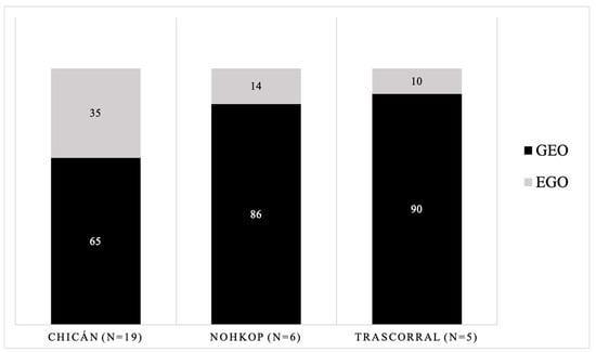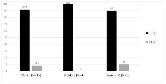 Results by community show an overall preference for the geocentric FoR; see Figure 7. In Chicán, 65% of all the participants’ results indicated that the task was resolved using the geocentric FoR, while Nohkop and Trascorral showed higher percentages (86% and 90%, respectively). However, looking at the combined results is not enough to estimate individual preferences. In (), the percentage per individual is considered significant when it is higher than 75%, meaning a clear preference for the geocentric FoR, and less than 25% implies a preference for the egocentric FoR. In the present case, considering results for all communities, only 2 participants show less than 25%, that is, they reliably used the egocentric FoR, while 10 participants display results between 28.5% and 62.5%, meaning they were not consistent in the task. Finally, 17 participants scored 75% or more, showing a reliable use of the geocentric FoR.