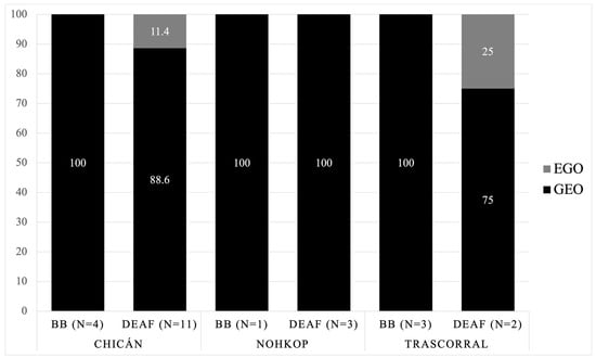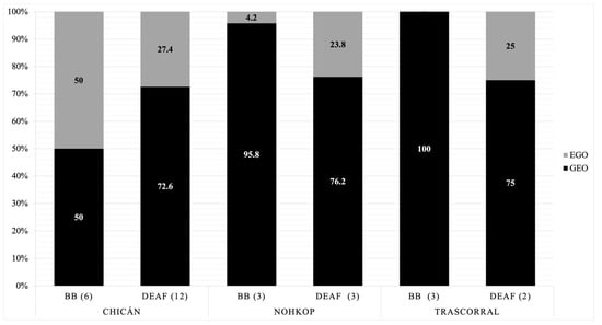 Overall, deaf signers show a consistent use of the geocentric FoR, with results in each community at around 75%. In Nohkop and Trascorral, Bilingual-Bimodal signers display almost exclusively a preference for the geocentric FoR when resolving this task. When looking at individual results, in Chicán, among the 6 hearing participants, 2 used the geocentric FoR 100% of the time, 3 consistently used the egocentric FoR and only one used both 50% of the time.