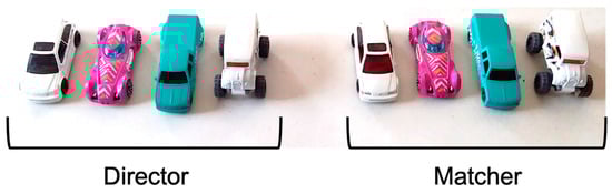 The two identical sets of car toys used as stimuli in the Director-Matcher task.