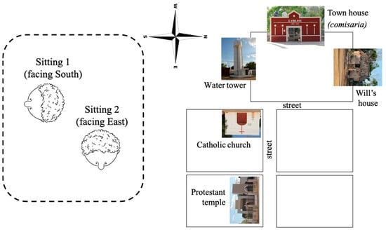 The localization task is a replication of a task also run in (). In this experiment, the participant is presented with two entities to be located with respect to each other; one serves as the Ground, and the other as the Figure. As in the previous tasks, two possible solutions are available to the participants, both equally valid. One option is to use the egocentric FoR, in which case the entities are located with respect to each other based on a projected viewpoint (for instance, “if the city hall is to your back, the water tower is to the right of the basketball court”). The second option relies on the use of the geocentric FoR, which should respect the real-world orientation of the Ground and Figure respective to each other (for instance, “the tower is South with respect to the basketball court”).