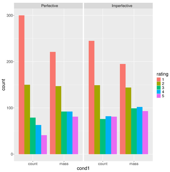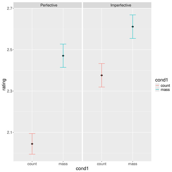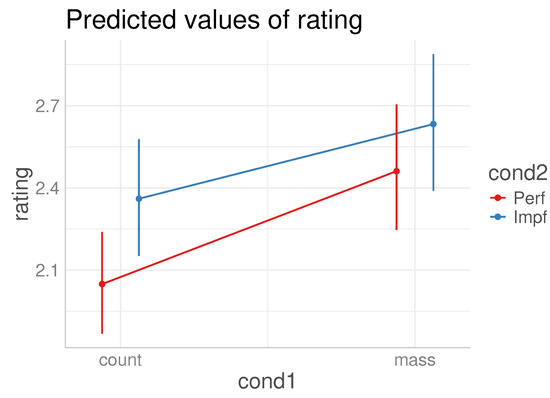 Recall from Section 2.4 the prediction derived from Grimm and Dočekal (2021): if the only restriction on sorting is that a mass noun cannot be sorted in an episodic sentence (here the perfective condition), then the restriction should be lifted from count nouns, which are already countable to begin with. This predicts that the mean rating of perfective will be lower than that of imperfective only in the mass condition, as in Table 1.