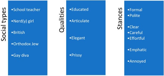 For instance, in his third-wave case study, Podesva (2007) examined the speech of “Heath” across different communicative contexts via acoustic measures and analyses of discourse functions of phenomena such as hyperarticulation, creaky voice, and falsetto. Hyperarticulation has been documented as indexing a range of social types, styles, or voices (e.g., aspirated intervocalic /t/ can invoke identity as a nerd(y) girl, a gay man, an Orthodox Jew, a speaker of British English, a school teacher), and thus in real time a gay man (i.e., Heath) has the agency to use longer bursts of /t/ aspiration to convey the persona of a “playful diva” at a social barbecue with friends (p. 4). In the first place, hyperarticulation becomes ideologically linked to these social types because it is associated with certain qualities (e.g., articulateness, elegance, educatedness, prissiness) that might be expected for a particular type of person. Moreover, in a given moment, a speaker may decide to hyperarticulate in order to take a particular stance (e.g., to be formal, polite, clear, emphatic, exasperated, angry, annoyed). It is precisely, then, the indexical connection between hyperarticulation and a particular form of gayness that makes Heath’s intentions clear to his audience of friends and enables him to play with (i.e., vary) language accordingly, making these features noticeable. These connections can be visualized in Figure 1 (see also Figure 4 of Eckert, 2008, p. 469). The particular qualities may be ideologically associated with multiple social types, and stances may be linked to a variety of different qualities. For instance, a school teacher and a nerdy girl may be associated with articulateness, and someone articulate and someone elegant may be linked to politeness. Thus, a range of social types, qualities, and stances come to form the indexical field of /t/ release. Some qualities may be more closely related and are therefore visualized more closely; the same is true for some stances.