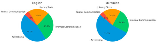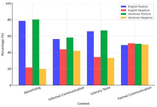 Advertising demonstrates the highest concentration of positive evaluative meanings in both languages, particularly in Ukrainian (80.2%). Formal communication exhibits a nearly equal distribution in Ukrainian (50.5% positive vs. 49.5% negative), whereas in English, a slight predominance of negative evaluations is observed (51.1%).
