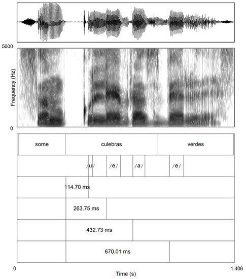 Figure 1 analyzes the nominal phrase (NP) some culebras verdes ‘some green snakes’. It shows a waveform and a spectrogram of the utterance followed by the tiers that measured the distance from the beginning of the code-switch from English to Spanish until the vowel token in question. To be more precise, Tier 1 displays the different words contained in the NP, Tier 2 shows the vowels we analyzed, and Tiers 3 through 6 delimit the distance from the end of the word in English until the beginning of the production of the vowel in Spanish.