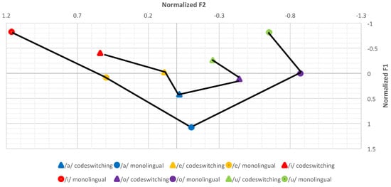 Vocalic triangle of monolingual (circles) and code-switching (triangles) vowels based on the averaged normalized F1 and F2 values.