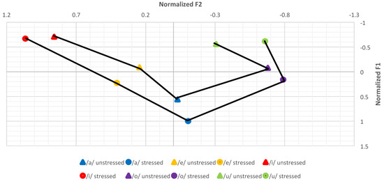 Vocalic triangle of stressed (circles) and unstressed (triangles) vowels based on the averaged normalized F1 and F2 values.