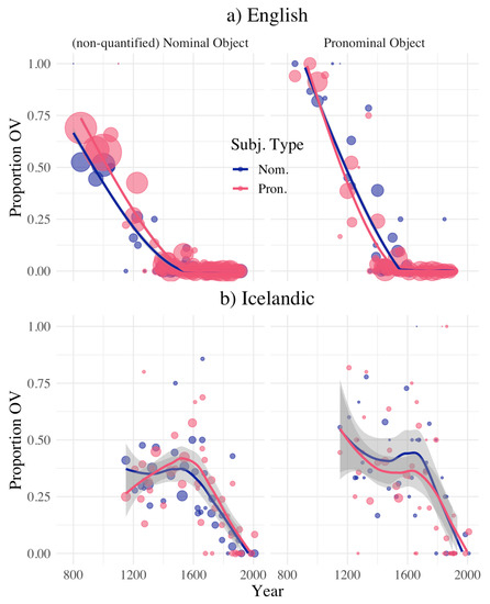 To check the effect of Subject and Object type statistically, we fit a mixed effects logistic regression separately to the English and Icelandic data, with fixed predictors for Year of text, Clause type, Subject type, and Object type, and random intercepts for individual texts (since individual texts can be idiosyncratic, and there were multiple observations per text). Unfortunately, no mixed effects models containing interaction terms would converge on this size of data set. However, a mixed effects logistic regression with a simpler structure did converge: OV ∼ (1|ID) + Clause + zYear + SbjType + ObjType. For English and Icelandic, the inclusion of terms for Subject and Object type did significantly improve the model fit (though estimated slopes are difficult to interpret without any interaction terms); for English: AIC (with Subject and Object type) = 12,529 vs. 13,249 (without), BIC = 12,601 vs. 13,285, for the model comparison on the Chi-squared distribution; for Icelandic: AIC (with Subject and Object type) = 6455 vs. 6549 (without), BIC = 6515 vs. 6582, . A standard logistic regression containing the Object type and Subject type interaction did show a significant effect of the interaction of Object type and Subject type on the probability of OV, in the expected direction: a pronominal Subject and a pronominal Object decrease the probability of OV (for English: , ; for Icelandic, the effect was borderline but in the predicted direction: , ), and both Subject and Object being nominal decrease the probability of OV with roughly the same effect size (for English: , , depending on combination of non-pronominal arguments; for Icelandic: same borderline effect as above for non-quantified/non-negated nominal Objects, and a significant effect decreasing OV when the Object is quantified/negated: , ). For both languages, slope estimates for the interaction between argument type and text date were not significantly different from zero, with depending on the argument combinations. Thus, the effect of the arguments together on OV is plausibly constant over time, making the Subject–Object interaction a Constant Rate Effect with respect to the OV to VO change.