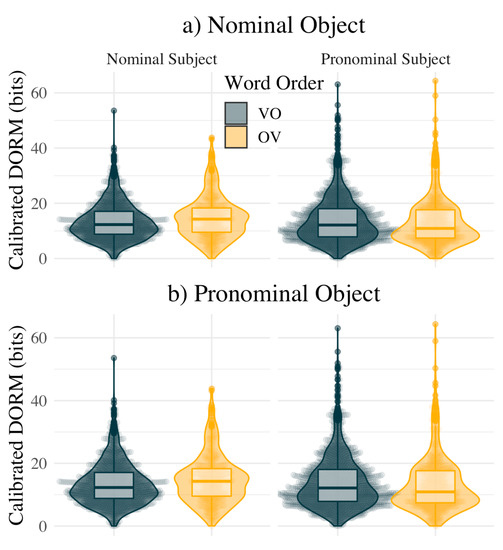 Figure 3. Calibrated DORM values for Icelandic sentences by Subject type, Object type and vP/VP word order. Note that where the Subject and Object types are matched in (a), VO results in greater uniformity (lower DORM), and elsewhere OV results in greater uniformity. In (b), the effect is less certain, and may be carried by the tails of the distributions.