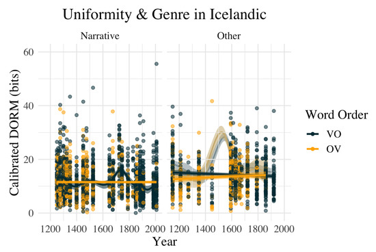 There is an effect of Genre on information density, and we take this to mean that there are additional pressures in favor of dense sentences in genres such as scientific writing (cf. e.g., Biber and Gray 2013; Bizzoni et al. 2020; Degaetano-Ortlieb and Teich 2019), law, and religious texts; these are the non-narrative genres in IcePaHC. This difference in non-narrative genres may be conceived as an effect of ’distance’ from spoken language, which would be related to (for example) the effect of literary vs. oral genre on information theoretic measures of language (Ortmann and Dipper 2019, 2020). Informationally dense sentences are not necessarily non-uniform, but uniformity will be harder to achieve if there are many fixed, large peaks in lexical information content. However, this simply means that an existing speaker bias towards information uniformity can intersect with a genre bias in certain types of writing. The only possible trend over time in DORM is in VO clauses from narrative texts. As the slope was not significantly non-zero, we should be cautious interpreting it, but it could reflect a very mild stylistic change: the 19th century Icelandic independence movement brought with it an approach to writing that sought to emulate the simple sentence structure and vocabulary choices of the Icelandic Sagas (Ottósson 1990, pp. 54–57). However, this is merely speculation.