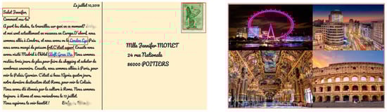 “Imagine that you and your partner(s) are on vacation somewhere and would like to send a digital postcard to a French speaking friend. In this multimodal writing activity, each team will jointly create their own postcard which will provide details such as date, appropriate greeting, recipient’s name, address (including house/apartment number, street, town/city, country, ZIP code), a postage stamp, your message (including information about the weather, your vacation activities, the duration of your stay, your return date etc.) and an appropriate closure”.