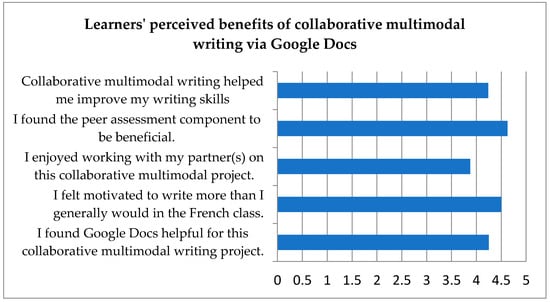 To address the first research question (how do French FL learners view the benefits and challenges of collaborative multimodal writing?), I begin by presenting learners’ perceived benefits based on the descriptive analysis of the Likert scale questions from the post-task survey and the content analysis of relevant responses obtained from the individual interviews.