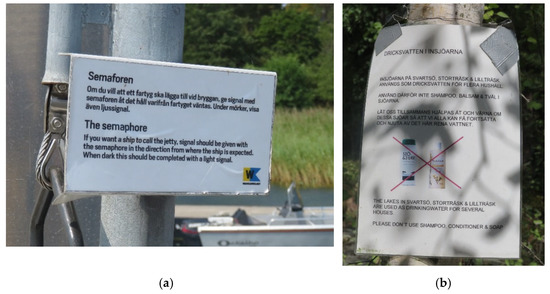 As seen in Figure 1, English is used in a translation of instructions for using the semaphore on a jetty and on a sign informing about the lakes of Svartsö being used for drinking water. In the latter case (see Figure 1b), the last paragraph of the Swedish text (commenting how “we together can take care of the lakes to keep enjoying the fresh water”) is omitted in the English version. As such, the sign is an example of multilingualism with overlapping but not fully identical content (cf. the typology introduced by Reh 2004). Most of the bilingual signs, however, give the same information in both languages, i.e., they include duplicating multilingualism (cf. Figure 1a).