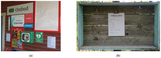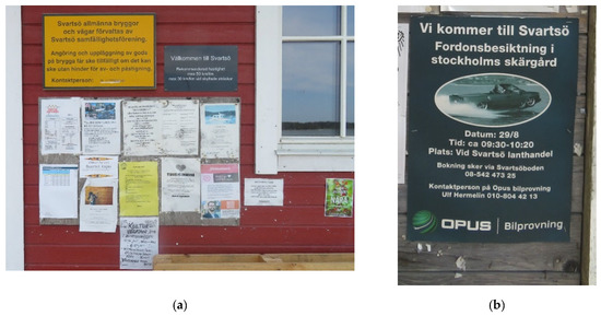 Examples from the linguistic landscape: (a) The bulletin bord by the jetty at Norra Svartsö; (b) a message about vehicle inspection service, “We’re coming to Svartsö” on the bulletin board at the central crossroads on Svartsö. Note the humorous image included in the sign in Figure 5b, evoking associations both with the service offered and the isolated position of the target audience, and thus highlighting the communicative potential of different semiotic resources found on signs beyond the verbal language.