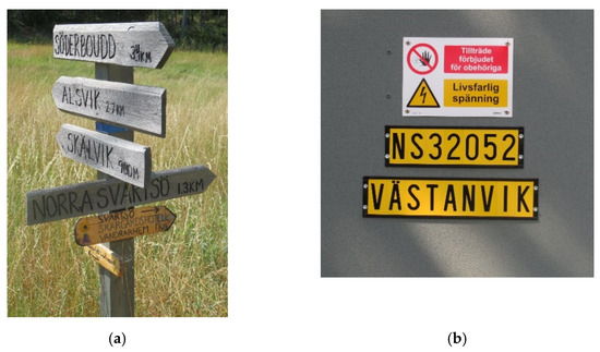 Examples of signs providing general information and instructions: (a) Signposts at a crossroads on Svartsö; (b) warning signs and a place name on an electricity sub-station on Nämdö.