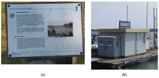 Examples of signs designed for the visitors: (a) Bilingual information post of the walking trail in the nature reserve on Nämdö; (b) commercial branding of the island at Solvik, Nämdö.