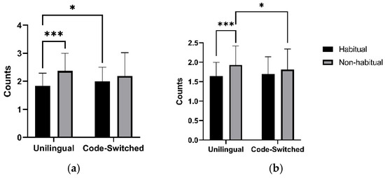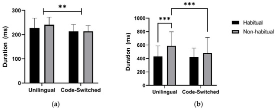 Total visit duration refers to the total amount of time the participants spent inside the AOI, including both the fixations and the saccades, and both the first encounter and the regressions (revisiting the AOI after moving away from it once). It is believed that the longer duration is an indicator of greater difficulty in comprehending the information (Cook and Wei 2017). An interaction between Language and Habit was found, F(1,30) = 9.37, p = 0.005, ηp2 = 0.24. A simple effect analysis found that the duration was significantly different between the Habitual-Unilingual (M = 432.27 ms) and Non-Habitual-Unilingual (M = 591.35 ms) conditions, t = −7.63, p < 0.001. Moreover, participants spent longer reading the Non-Habitual-Unilingual condition (M = 591.35 ms) than the Non-Habitual-CS condition, (M = 481.21 ms), t = 4.34, p < 0.001. No significant difference was found between the Habitual-Unilingual and Habitual-CS conditions, t = 0.51, p = 0.612. See Figure 2b.