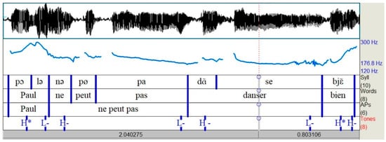As for the Japanese learners’ productions, they are characterized by short APs of two syllables as in (28). In addition, APs often receive edge tone of the form H- at the left edge and L- at the right edge, whether they contain a pitch accent or not. In (28), the AP (paul) receive a H* pitch accent on the syllable/po/and a L-edge tone, whereas the APs (ne peut pas) and (danser) just receive an initial edge tone H- and a final one L- as the final syllables of these APs are realized with a flat or slightly falling pitch contour and a significant syllabic lengthening, as shown in Figure 2.