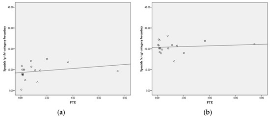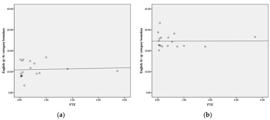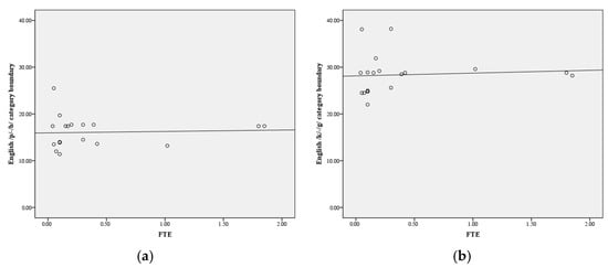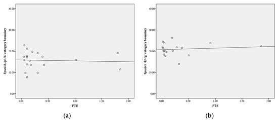 The same procedure was conducted for the Spanish learners. Table 4 presents the category boundaries and FTE for each Spanish participant. The mean FTE calculated for the Spanish learners of English was 2 (SD: 2.2) and their range was greater than in the case of the English learners of Spanish (0–7.4). However, most participants—i.e., ten—presented low FTE values, from 0 to 0.3, whereas five of them presented values between 0.4 and 2—i.e., medium values, according to Flege (2021)—and three of them presented higher FTE values which were above 2 (see Table 4 and Figure 3 and Figure 4 for individual results). The mean category boundaries were later in English than they were for the Spanish contrasts: English /p/–/b/: 11 (SD: 1.8); English /k/–/g/: 24.6 (SD: 3.3); Spanish /p/–/b/: 9.1 (SD: 3.6); Spanish /k/–/g/: 20.9 (SD: 2.9). None of the tests yielded a significant correlation (see Table 5). Moreover, as the scatterplots in Figure 3 and Figure 4 show, the examination of individual values did not show a clear pattern, as participants with the highest FTE values did not always present later category boundaries than the mean, whereas that was sometimes the case for participants with low FTE values.