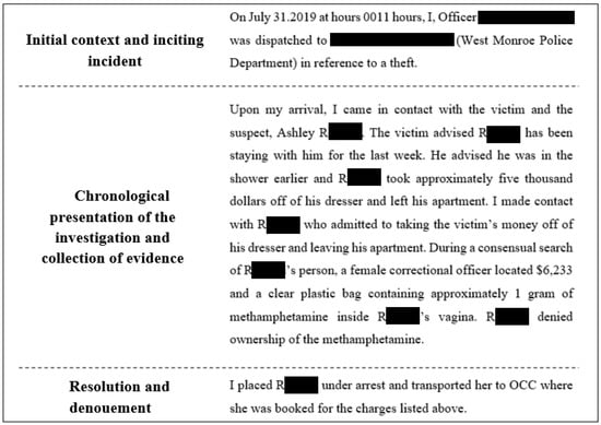 The internal structure of probable cause affidavits is not fixed, but several regularities emerge. Following John Swales’s genre analysis approach (), the results of the present research indicate that PCAs generally adopt a prototypical structure characterised by three rhetorical moves signalled by specific linguistic markers. It is organised around a chronological narrative of the facts, and the three moves follow a prototypical narrative structure in three acts: (1) exposition, (2) investigation, and (3) resolution/denouement. The first move is devoted to the presentation of the initial context. After specifying the exact date, time and location of the intervention, the police officer presents the triggering event or inciting incident (emergency call, flagrante delicto observed during a patrol, transfer of a file between two police units or forces …) and the type of offence under investigation. In the second move, the police officer sheds light on the various investigative steps taken (such as taking statements or viewing recordings from the cameras that filmed the scene) and the evidence collected. In the third and final move, the conclusion is made up of the findings on the existence of probable cause and details of the arrest of the suspect when applicable. Therefore, the reader is guided step by step by the author, who presents the events in a chronological and structured manner. The breakdown of affidavit PC_LA_WestMonroePD_20197 (Figure 1) illustrates the use of this prototypical three-stage structure8.