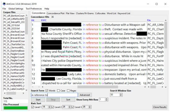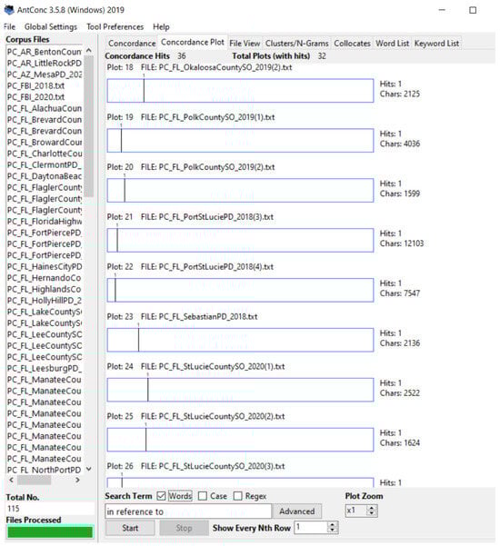 Distribution of the prepositional phrase in reference to in probable cause affidavits (AntConc, Concordance plot).
