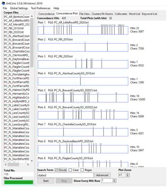 Distribution of stated in PCAs (AntConc, Concordance plot).