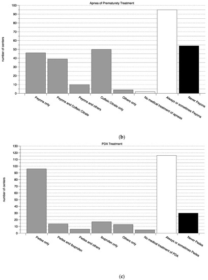 Use of on- and off-label medications. (a) Treatment of hemangiomas, (b) treatment of neonatal apnea, (c) treatment of PDA. From left to right, and for each indication in a separate panel, the number of centers is shown that use only the on-label medication, the on- and the off-label medication, the on-label and other medications, only the off-label, only other and no treatment (all bars shown in grey). On the right of each panel, the number of centers that always or sometimes treat with the on-label medication is shown in white and the number that never uses the on-label medication is shown in black. PDA—persistent ductus arteriosus.