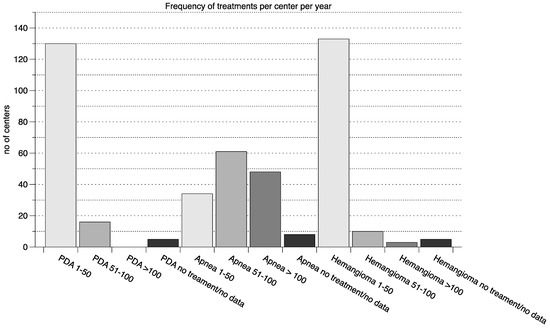 The majority of centers conducted between 0–50 treatments in each indication per year with the exception of apnea of prematurity, in which the most centers conducted 50–100 treatments per year (further details in Figure 2).