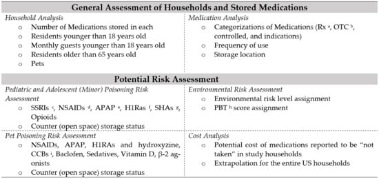 The risk analysis assessed whether high-risk medications for poisoning of minors and pets were stored on the counter by the households with a resident or monthly guest younger than 18 years old and a pet. Based on the literature, high-risk medications were determined as those more commonly involved in poisoning or associated with serious poisoning with harmful outcomes for minors and pets, particularly dogs and cats. The types of pets owned by the households were not asked in the survey, and it was assumed that the households owned either dogs or cats for simplicity and to adapt the findings of Cortinovis et al. [].