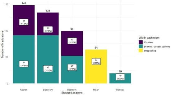 Most medications reported in the study were stored in bedrooms, kitchen, and bathrooms. The alarming trend was a high number of medications being stored in bathrooms, which is inappropriate for medication storage. Funk et al. did a separate analysis for the appropriateness for each reported medication and their storage space, utilizing the published humidity and temperature ranges of various household locations and specific medication storage recommendations [].