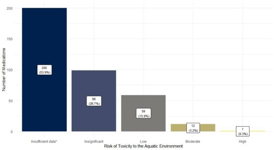 Toxic risk levels assigned to the aquatic environment of the reported medications based on the 2014–15 Environmentally Classified Pharmaceuticals by the Stockholm County Council [] (n = 371) * “Insufficient data” includes medications with undetermined risk levels due to insufficient evidence or those that were not mentioned in the Stockholm report.