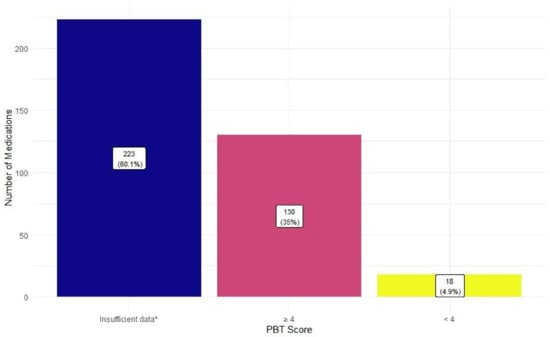 Persistence (P), Bioaccumulation (B), and Toxicity (T) scores of the reported medications. The PBT score is a sum of the P, B, and T score, each ranging from 0–3, assigned to a particular medication reported in the 2014–15 Environmentally Classified Pharmaceuticals by the Stockholm County Council. The higher the score, the higher the risk [] (n = 371) * Medications without a PBT score in the Stockholm report were categorized as “insufficient data.”.