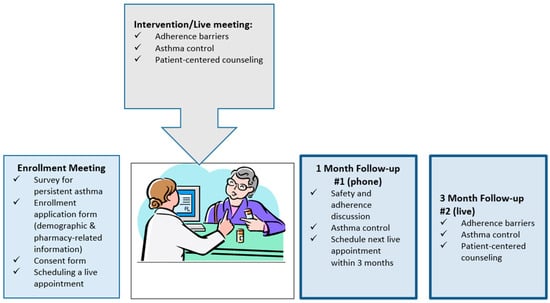 In addition to adult age and persistent asthma, other inclusion criteria were: (a) having a prescription for an asthma control inhaler, (b) willing to provide consent and personal contact information, (c) willing to be contacted via phone by the pharmacist for a 1-month post-initial follow-up and (d) willing to be contacted for a 3-month in-person follow-up with the pharmacist. If all criteria were met, then a consent form was signed, followed by the intervention. The participants who completed the study received two USD 25 gift certificates (baseline and 3-month follow-up).